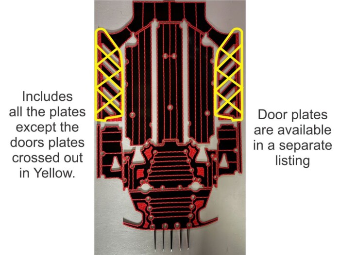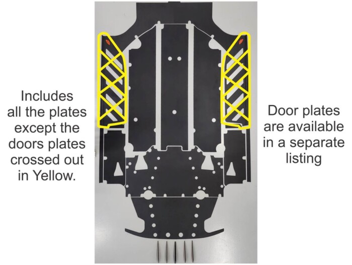 This package includes everything needed to install your 16 piece Ford GT 2nd Gen Underbody skid plates. In some of the pictures the Yellow circled plates are not included in this listing. There is a separate listing for the door skid plates.